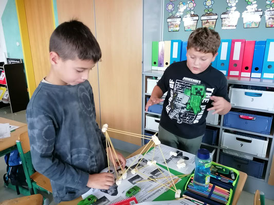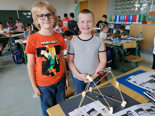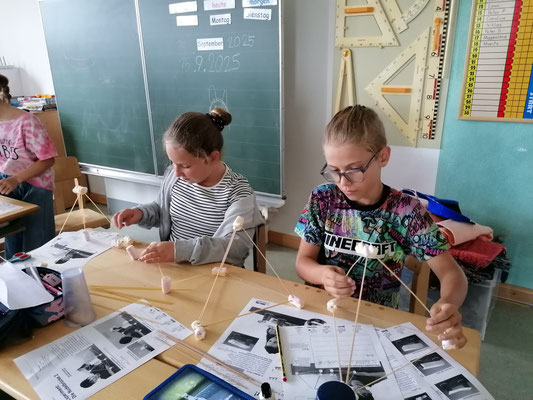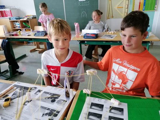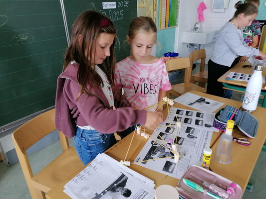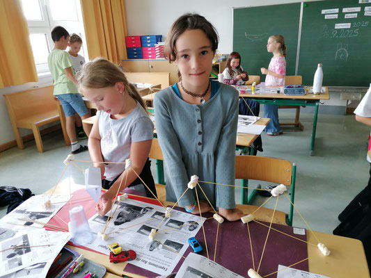 In der ersten MINT-Einheit im Schuljahr 2025/ 26 beschäftigten sich die Schüler*innen mit dem Bauen von Brücken. Nach einer kurzen theoretischen Einführung, welche Brücken es gibt, bauten die Kinder mit Papier, Nudeln und Marshmallows drauf los. Natürlich wurde jede Brücke auch auf ihre Belastbarkeit getestet. Die beiden Einheiten vergingen wie im Fluge und es waren alle mit großem Eifer dabei!